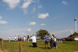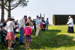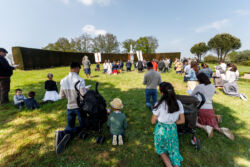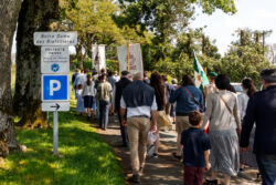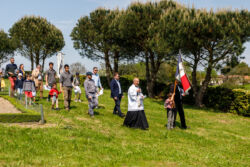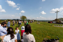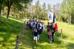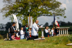 Après une prière au Sacré-Cœur de Jésus et au bienheureux Noël Pinot pour les prêtres, nous sommes partis en chantant le rosaire. Nous avons fait halte à la chapelle familiale de Notre-Dame des Rinfillières, bénie par le cardinal Pie, pour y prier sainte Jeanne d’Arc. Chaque chapitre a vénéré son saint patron, par des litanies ou des prières : saint Louis Marie de Monfort, sainte Radegonde, Bienheureux Noël Pinot, les saints Enfants Martyrs des Lucs et saint Philibert. Nous avons rendu hommage aux Vendéens dans la Vallée des Martyrs, par le chant du Vexilla Regis. À la grande Croix l’abbé Laurençon nous a accompagnés dans le renouvellement de notre consécration aux saints Cœurs unis de Jésus et Marie, suivie de la bénédiction des pèlerins et des familles.