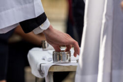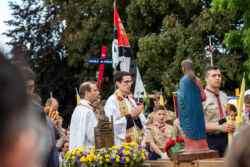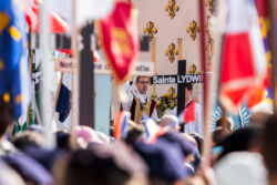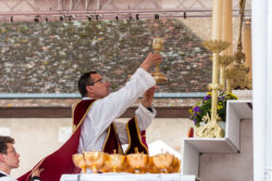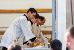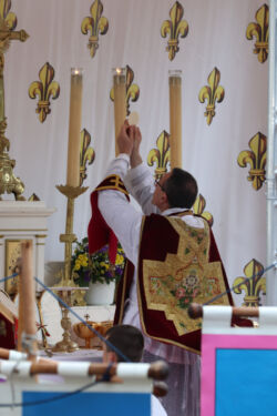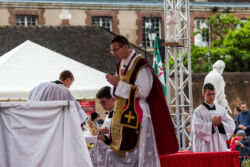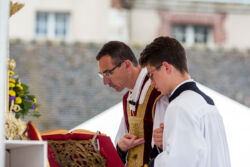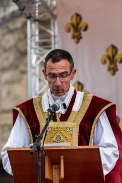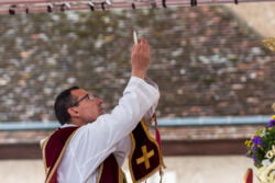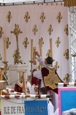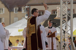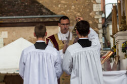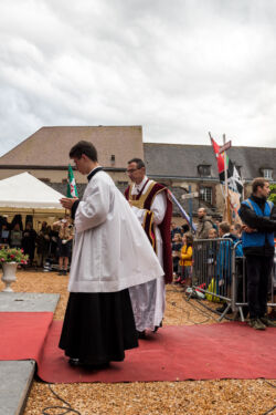 C’est M. l’abbé Bruno France, prieur de Nantes, qui célébra la messe chantée, déjà retardée de quelques minutes par les aléas climatiques, et procéda à la bénédiction des bannières, à l’issue de la messe.