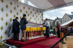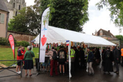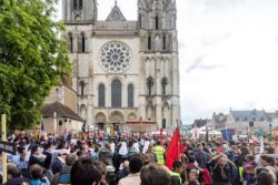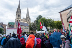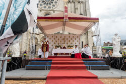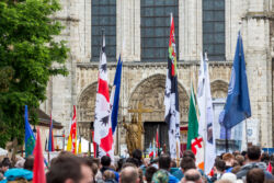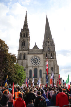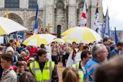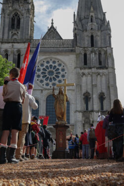 Après deux ans d’interruption du pèlerinage, les pèlerins se sont retrouvés en grand nombre sur l’esplanade de la cathédrale de Chartres, les jardins de l’évêché étant inaccessibles pour cause d’éboulement.